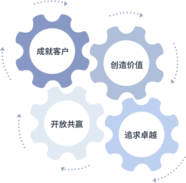 成就客户是一切决策的出发点,,,,创造价值是衡量所有工作的标准,,追求卓越是我们做事做人的态度,,开放共赢是我们的格局也是最终的结果。。价值观的齿轮环环相扣,,,,推动着组织里的每个人不断向前。。。。