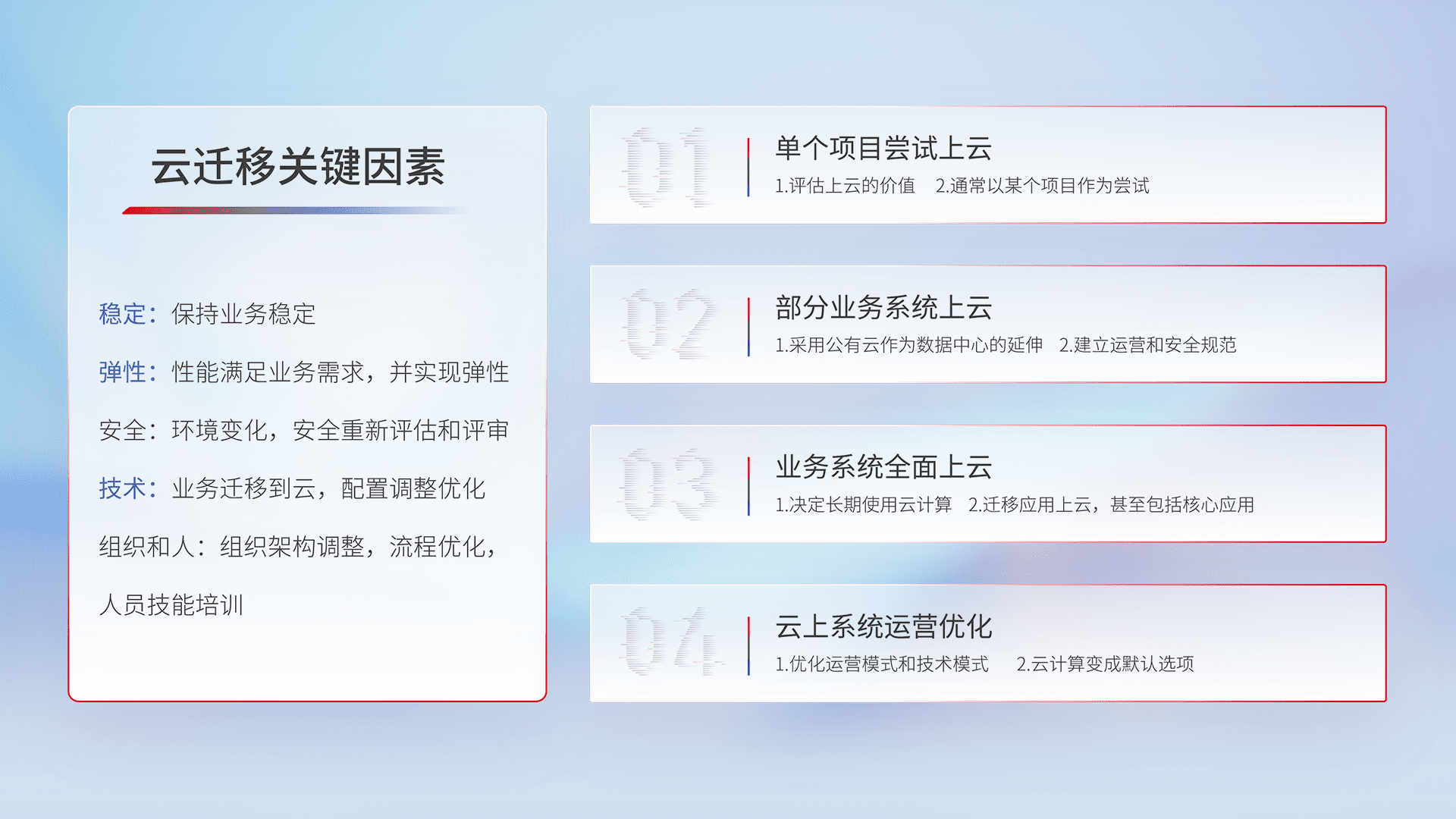 结合实际业务,,,,从规划设计、、、、云平台选型、、云原生改造、、、数据迁移、、集成交付,,,迁移全过程为客户识别最佳上云路径,,,做好风险识别管理,,,设计网络架构、、身份权限、、安全审计合规、、操作审计、、、、日志审计、、、、监控告警策略、、、、多站点容灾设计等,,,,对云上基础设施进行整体规划,,,提升IT治理水平,,,,以满足弹性、、、高可用、、、高性能的需求。。。