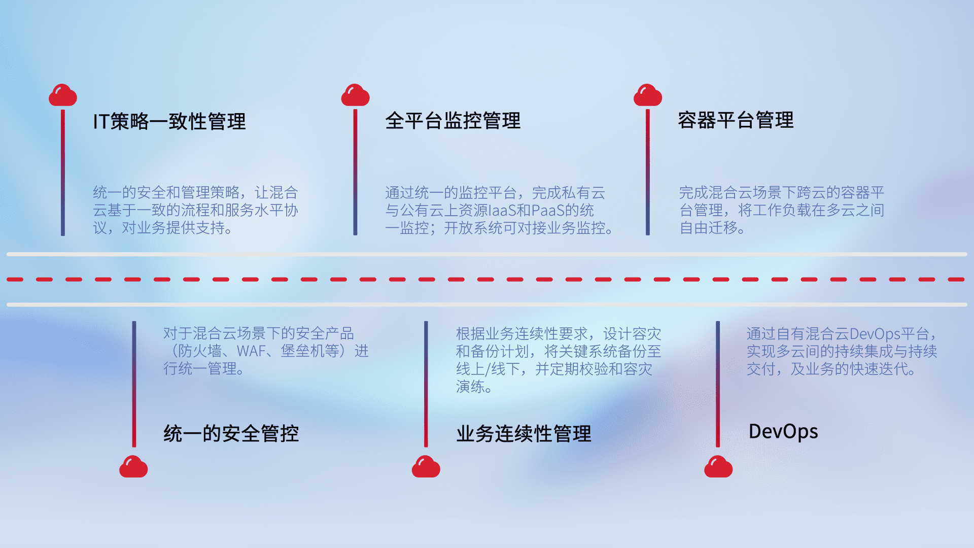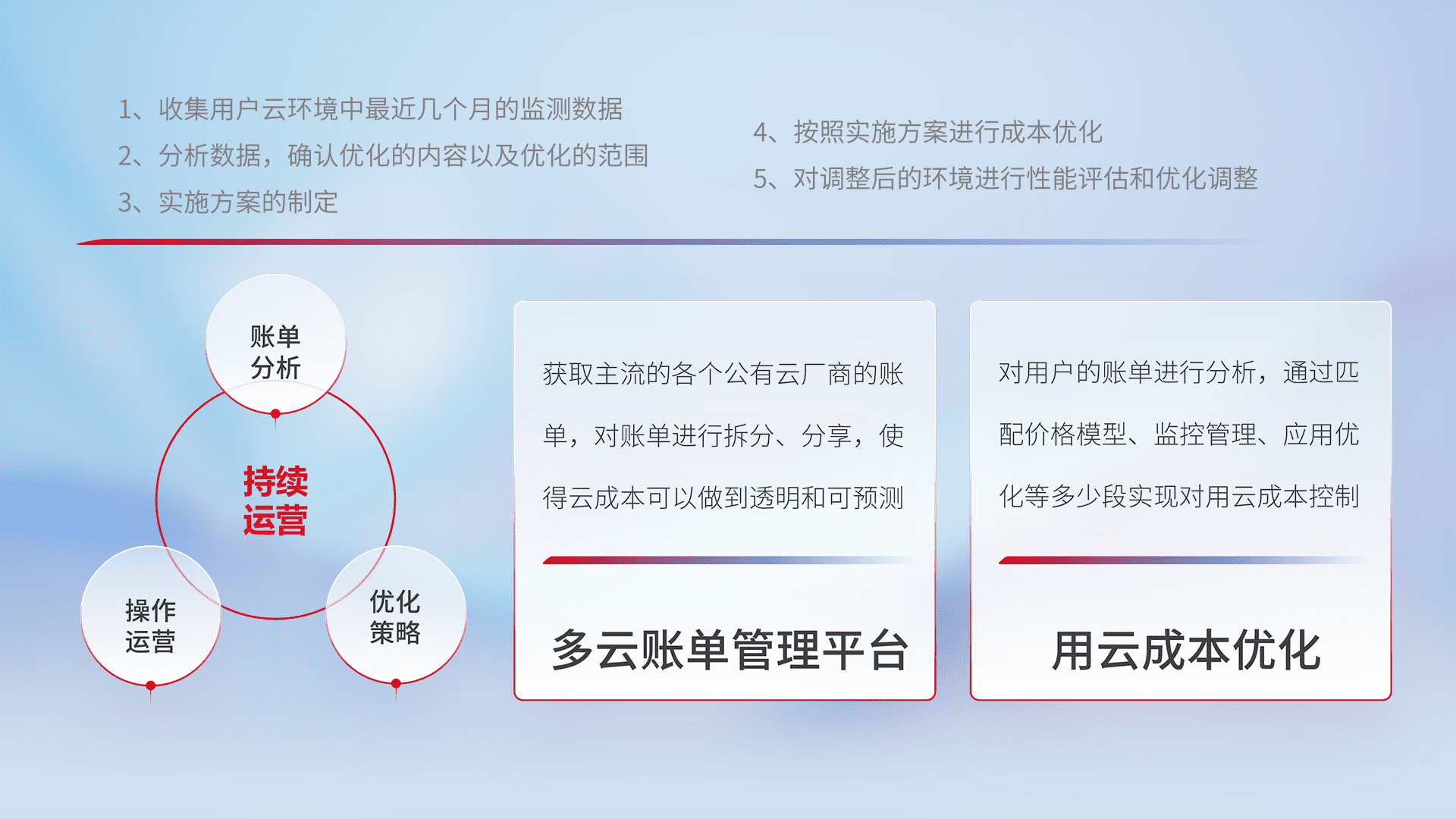 通过多云纳管,,,,以统一的资源数据模型把客户的云资源进行抽象和封装,,,,进而实现对多云资源的统一操作,,保障云资源管理的可靠性、、、稳定性与可用性。。。量身定制化运维内容,,配置、、、、开发运维、、、补丁管理、、备份、、、监控、、、、认证和访问管理、、、审计和日常巡检等,,,保障在用云过程中的可靠度,,,稳定度以及高可用率。。。